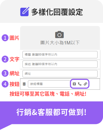 提供不同的回覆模式與應用,搜集各式訊息中的關鍵字與名單資料,以利更精準的行銷!